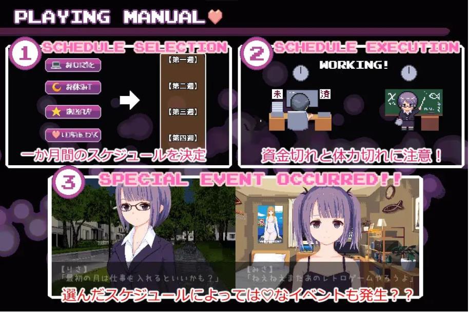 这是在可欣赏动态点阵图和音效的动画集基础上,加入了日程管理游戏和视觉小说元素的作品。